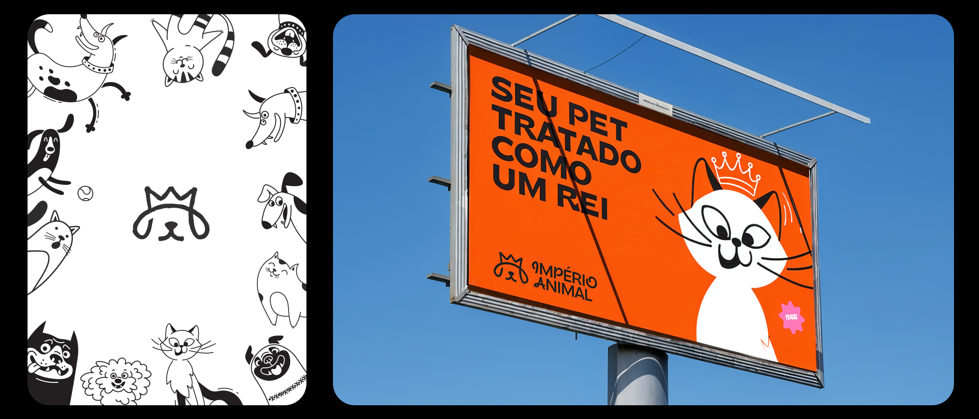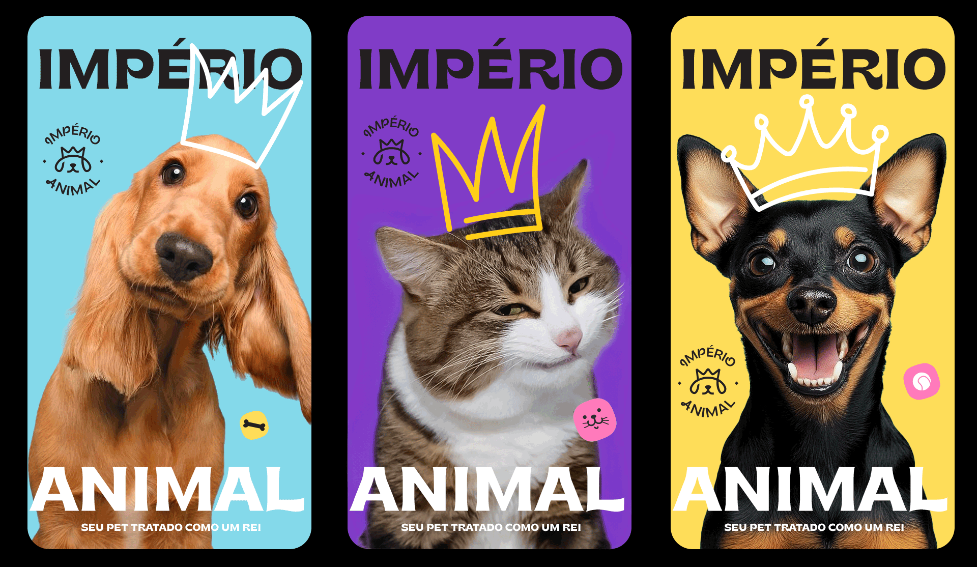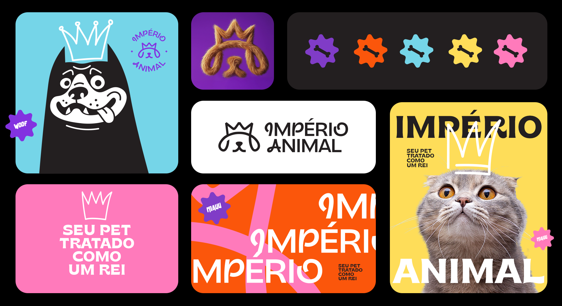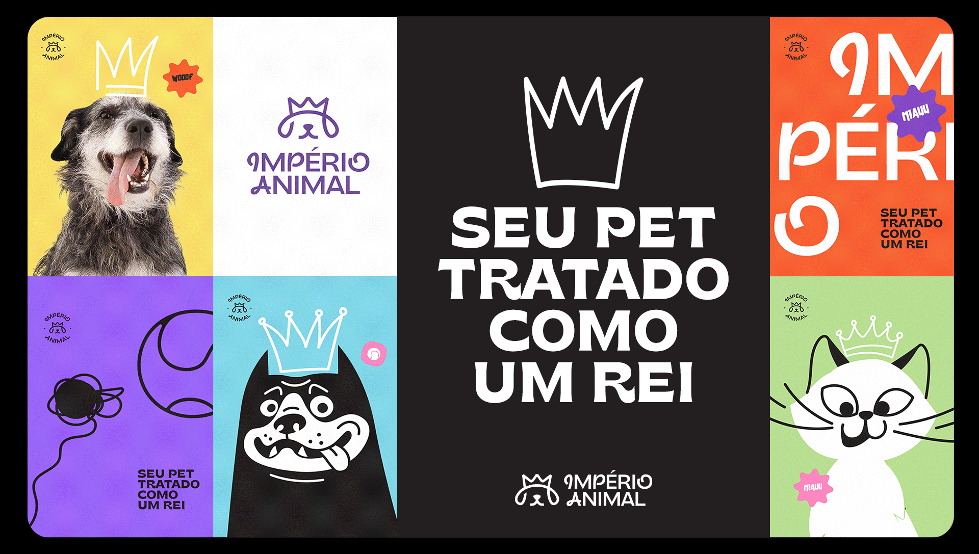 The identity was also designed to be highly adaptable. The brand works across different formats, including vertical and horizontal versions, stamps, and layouts with illustrations. Photos of pets with illustrated crowns on their heads help reinforce the brand’s positioning in a playful and emotional way. Illustrations of various breeds also emphasize diversity and help pet owners see their own animals reflected in the brand materials.
