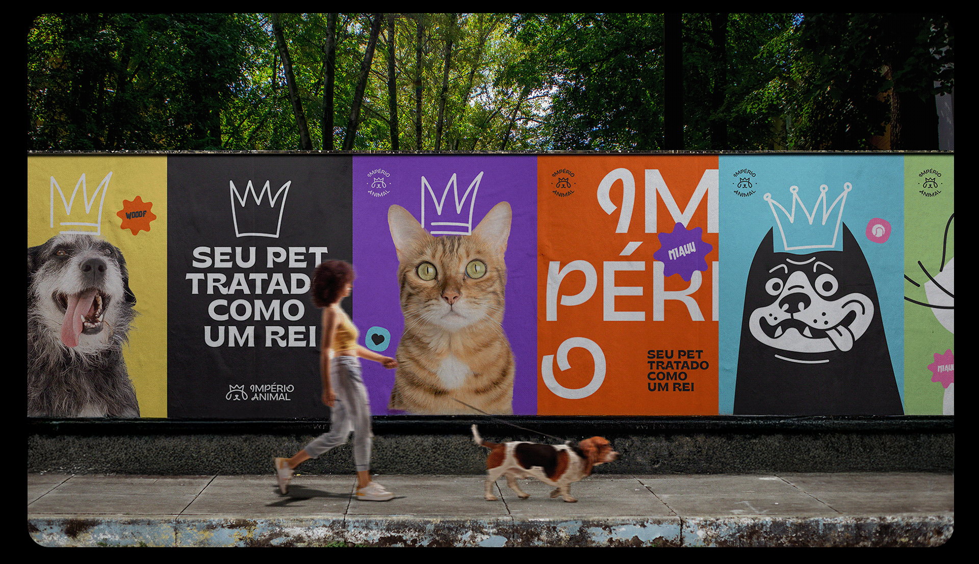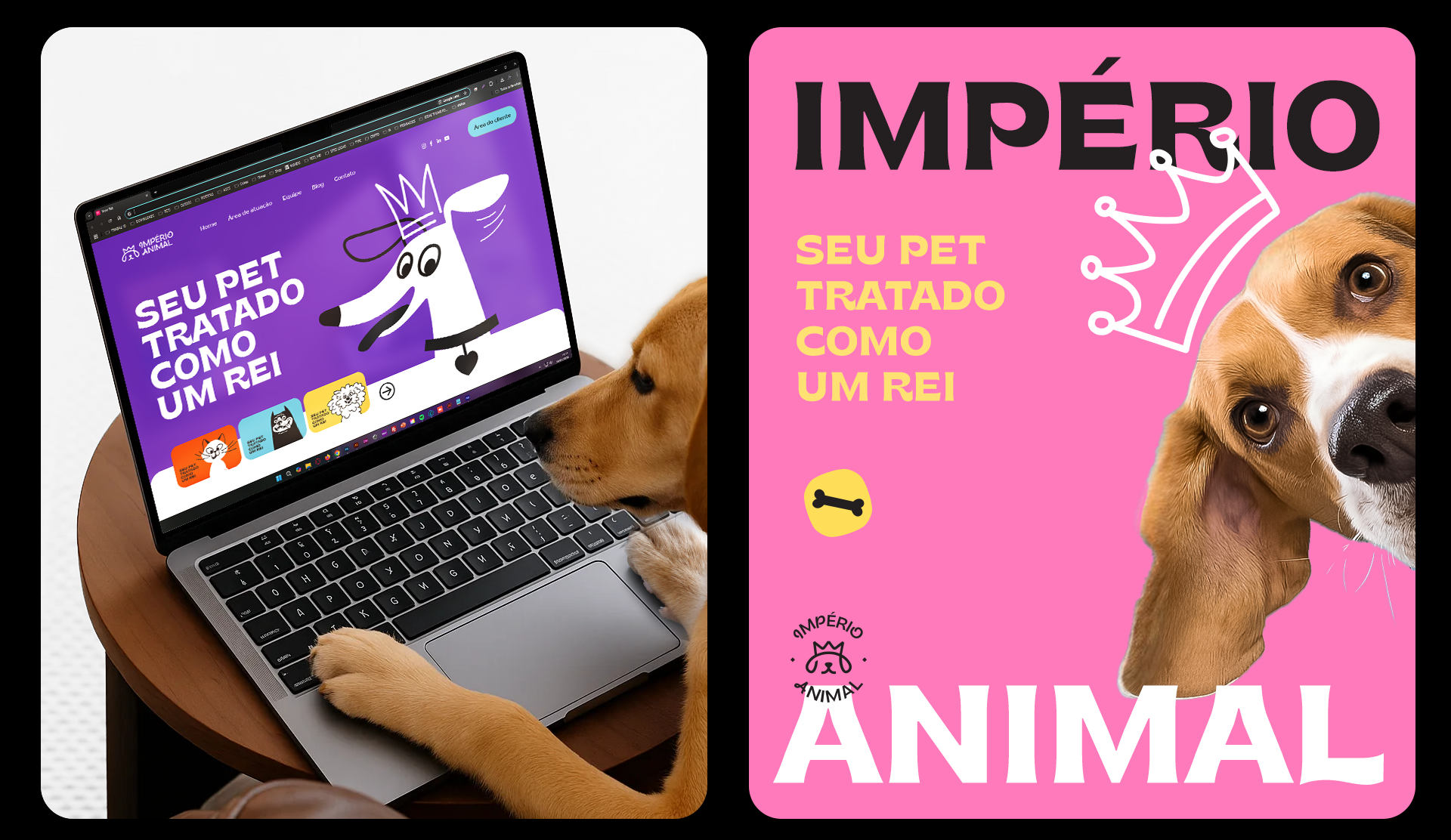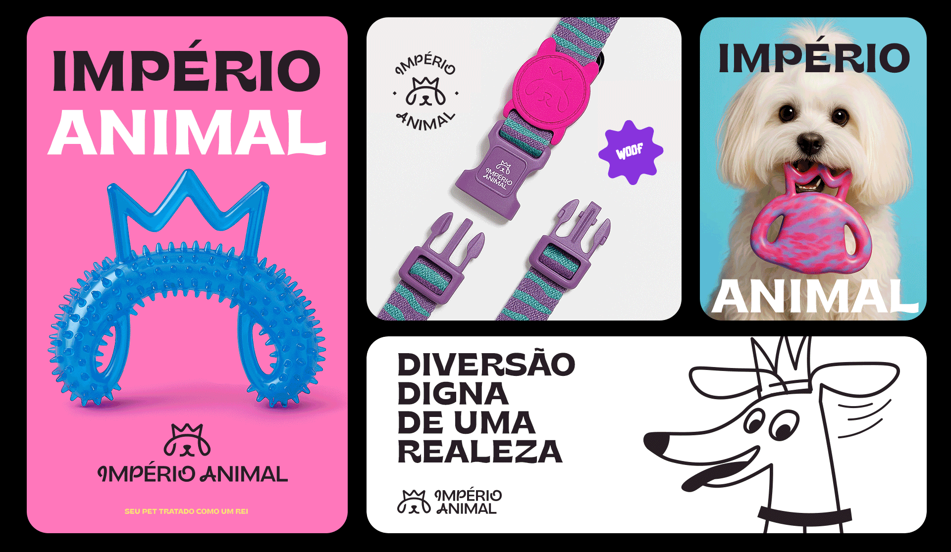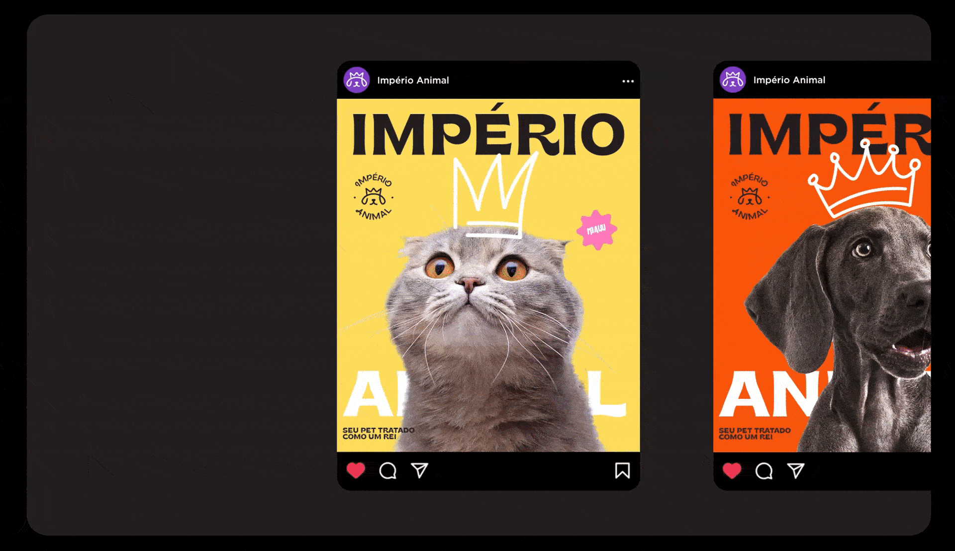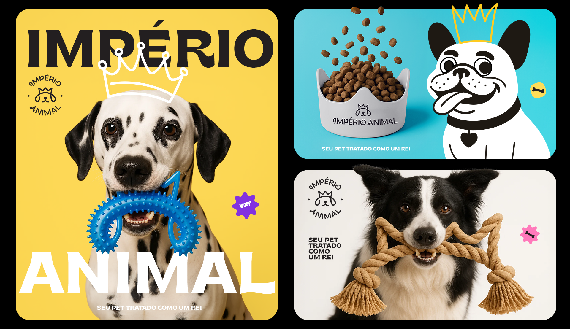 The identity was also designed to be highly adaptable. The brand works across different formats, including vertical and horizontal versions, stamps, and layouts with illustrations. Photos of pets with illustrated crowns on their heads help reinforce the brand’s positioning in a playful and emotional way. Illustrations of various breeds also emphasize diversity and help pet owners see their own animals reflected in the brand materials.
