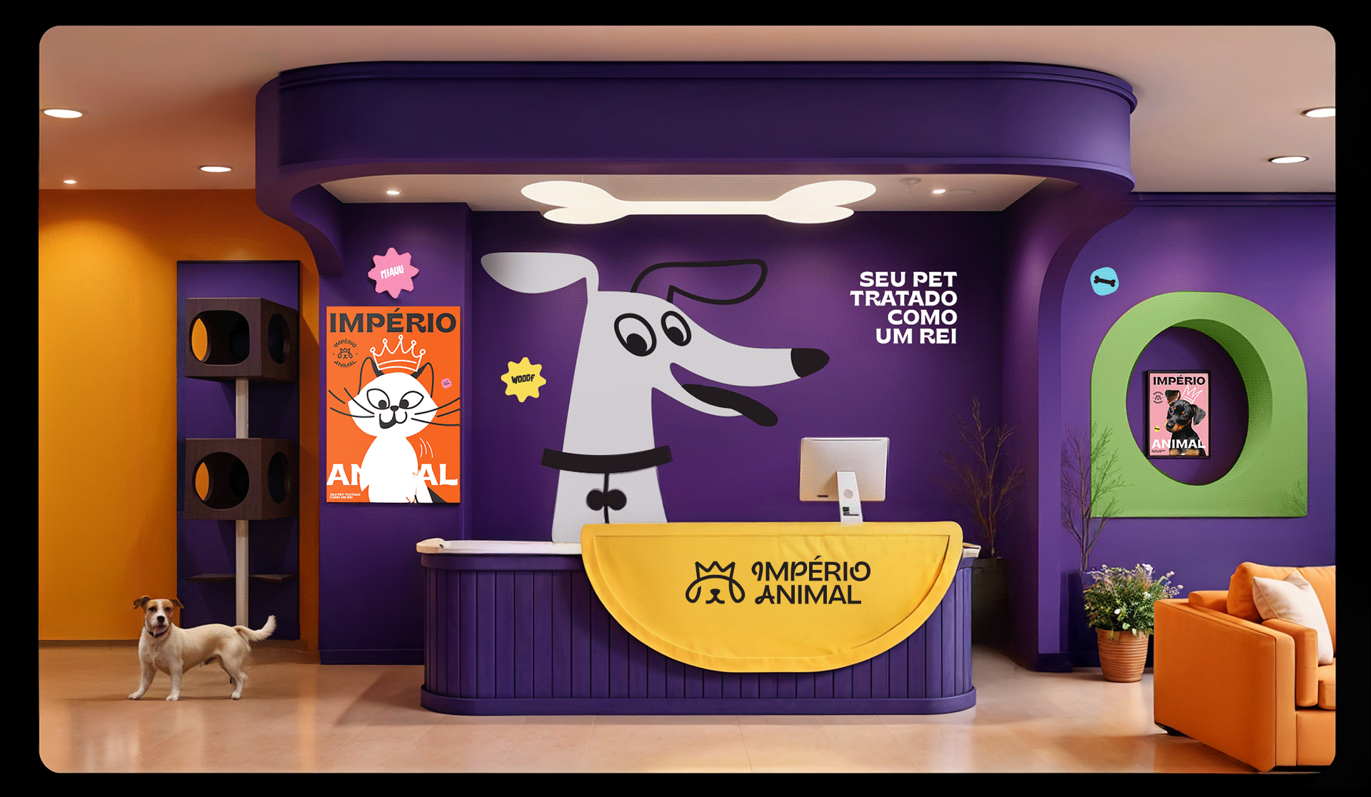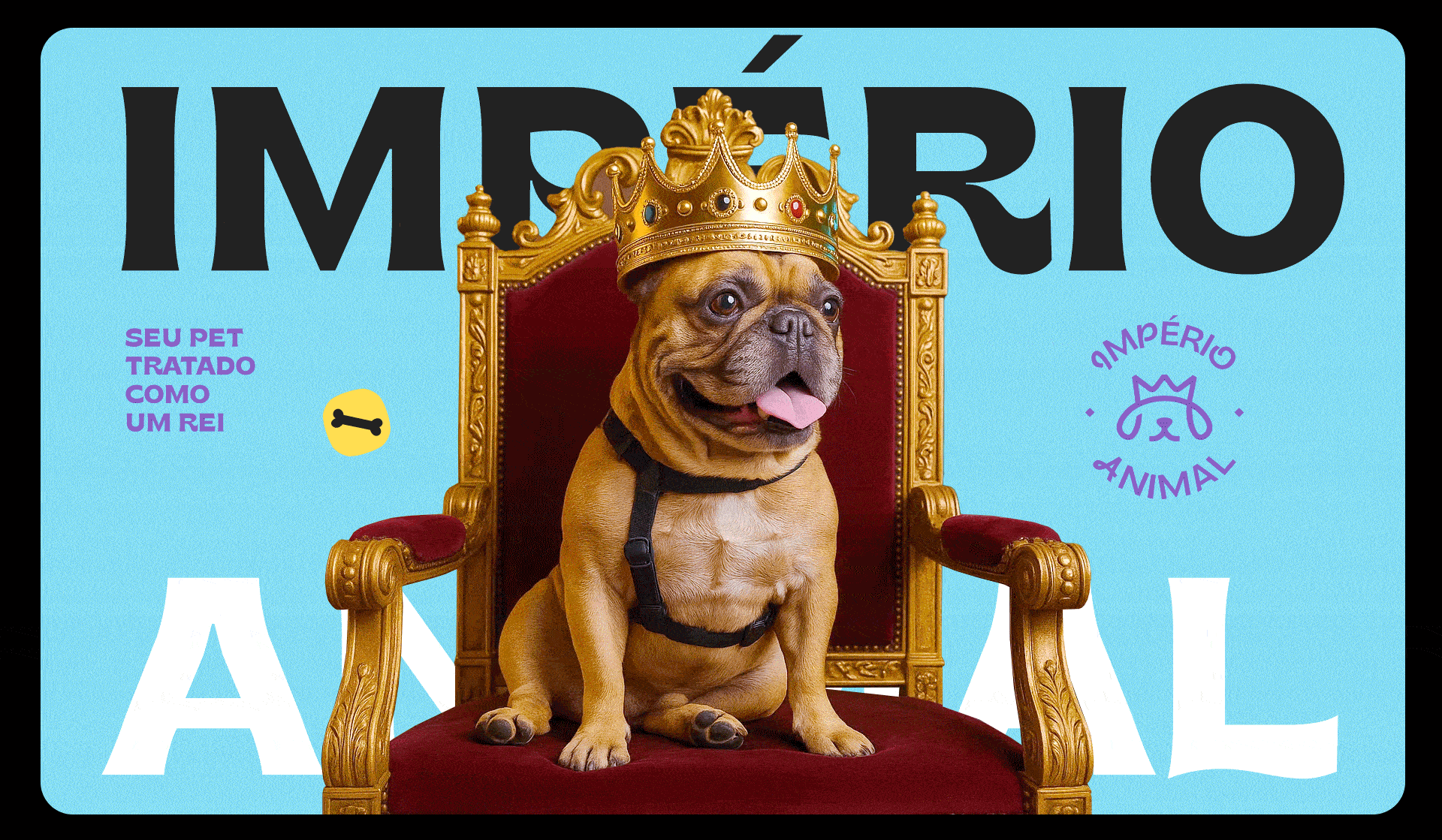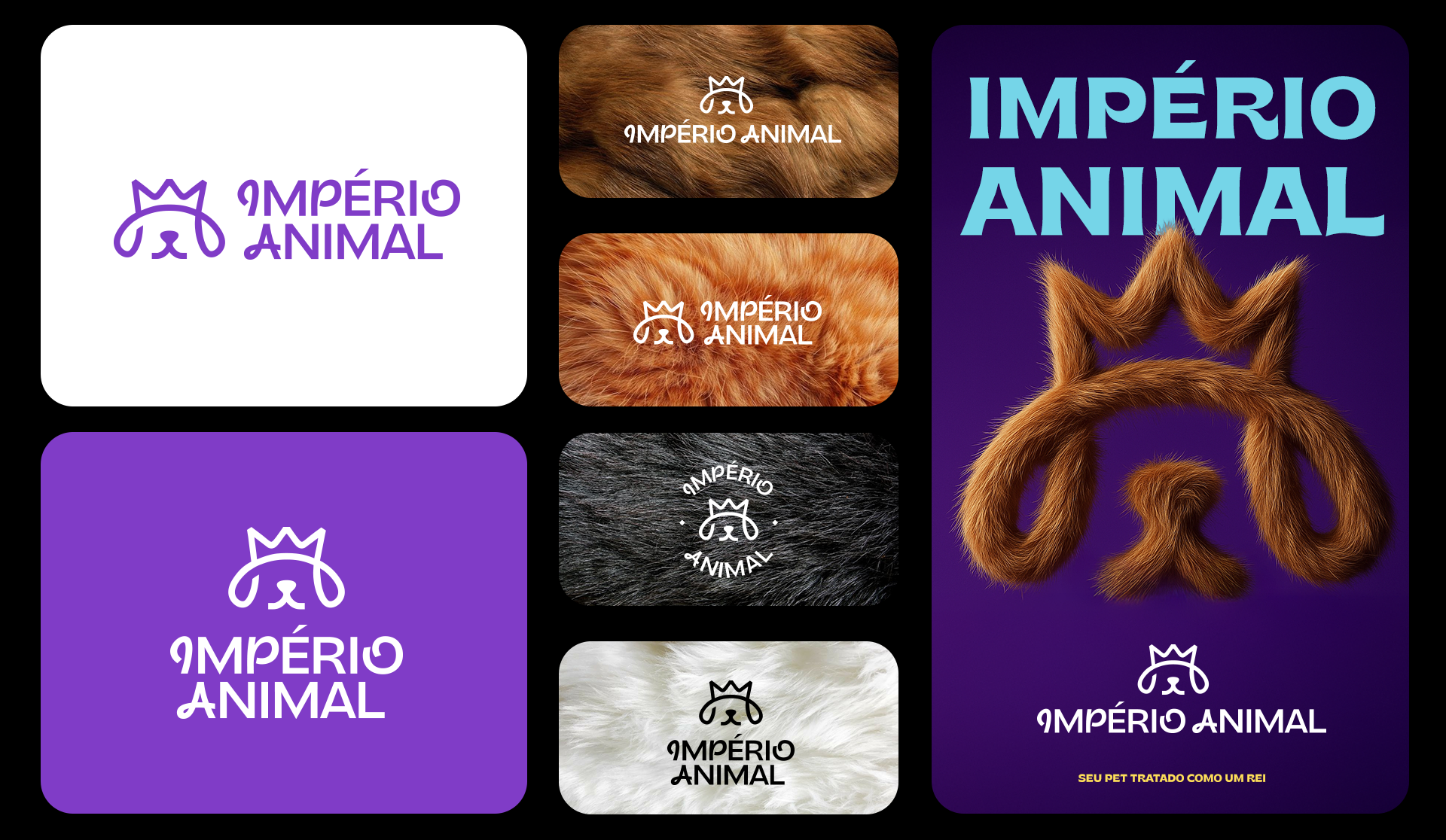 A identidade visual foi criada com a proposta de tratar cada pet como realeza. O símbolo da marca une a coroa, que representa nobreza e o focinho de um animal, que traz empatia e identificação do segmento, formando um ícone simples e que comunica instantaneamente o universo da marca.
